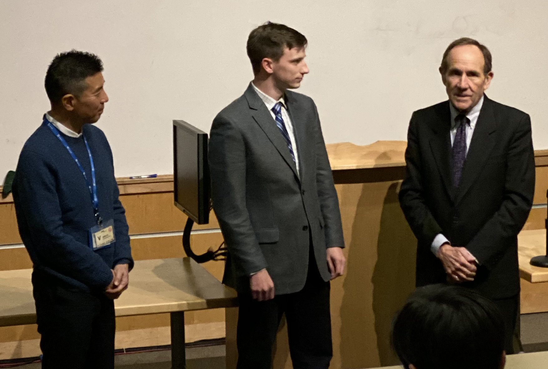 Congratulations to Andrew Mahre, SoM/ARRC graduate student, for being named the recipient of the 2019 Weathernews Inc. (WNI) Scholarship. The $5000 award, established in 2017 to enhance advanced research and development of radar technology, is presented annually to an outstanding ARRC student studying weather radar, observations of the atmosphere, data analysis, and implementation. Pictured with Andrew are Chihito Kusabiraki, President & Representative Director of WNI, and Berrien Moore, Dean of the College of Atmospheric and Geographic Sciences at OU.