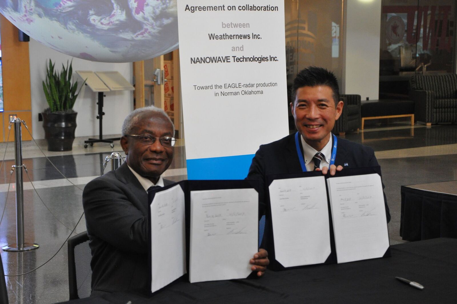 Weather radar technology developed by the ARRC is being utilized in a new potentially life-saving research collaboration with Weathernews Inc. (WNI) and Nanowave Technologies Inc. Over the past two years, collaboration between the ARRC and WNI has led to the development of a new and innovative radar known as the Enthusiasm for Asia-Genesis Leading Edge (EAGLE) radar. The first prototype of the EAGLE radar was designed and developed at the ARRC, and OU has since been instrumental in bringing WNI and Nanowave together for the manufacture of the radar. A research agreement was recently formalized at a signing ceremony held at the National Weather Center. Signing the agreement were Justin Miller (President, Nanowave) and Chihito Kusabiraki (CEO, WNI). Click here for full story.