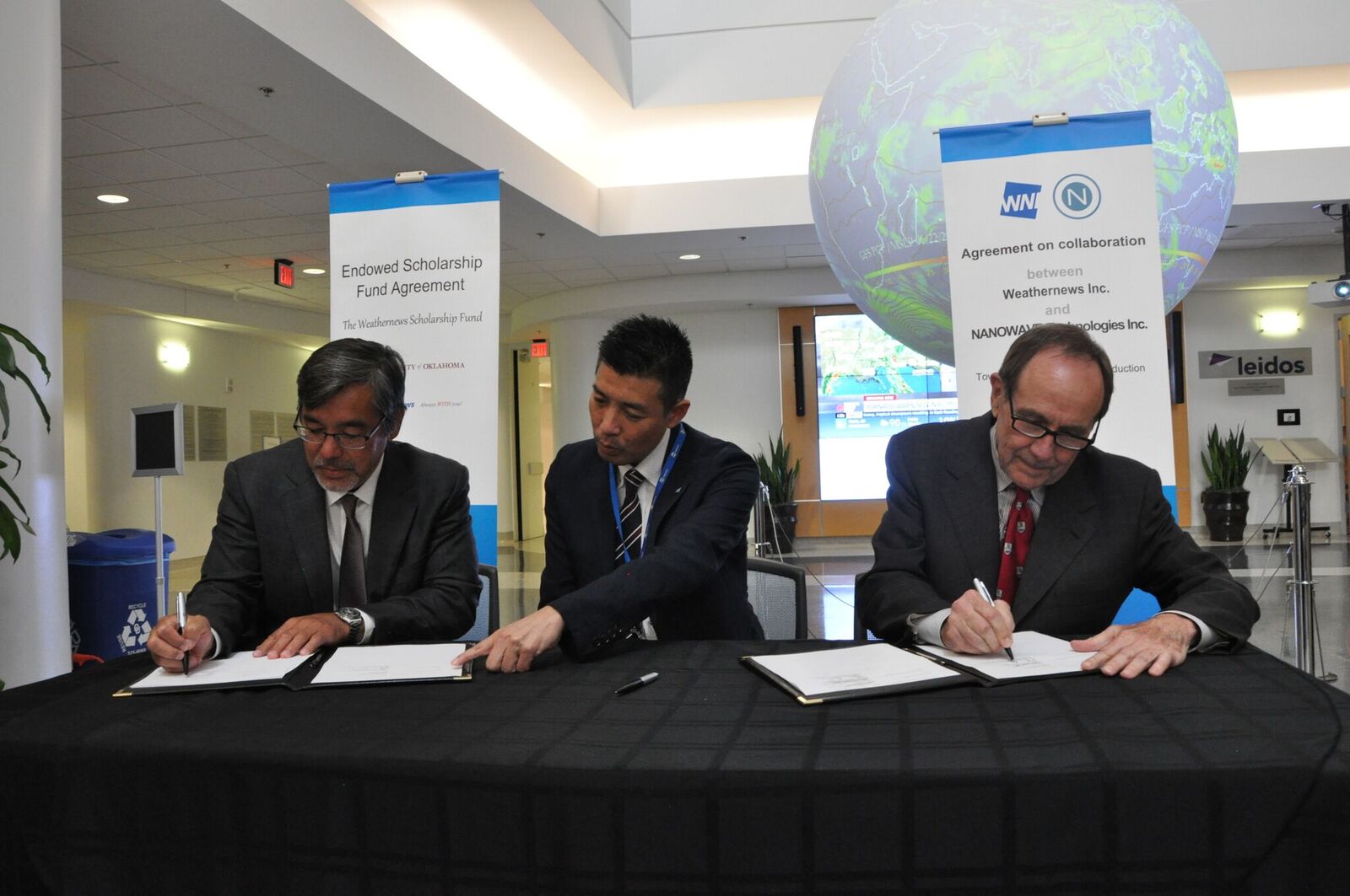 As a result of several very successful collaborative research projects with OU over the past decade, Weathernews Inc. (WNI) has established a scholarship fund through the OU College of Atmospheric and Geosciences (CAGS) in order to enhance advanced research and development of radar technology. The scholarship will be awarded annually to an outstanding ARRC student who is studying weather radar, observations of the atmosphere, data analysis, and implementation. Pictured signing the agreement (l to r) are Dr. Robert Palmer (Executive Director, ARRC), Chihito Kusabiraki (CEO, WNI), and Dr. Berrien Moore (Dean, CAGS).