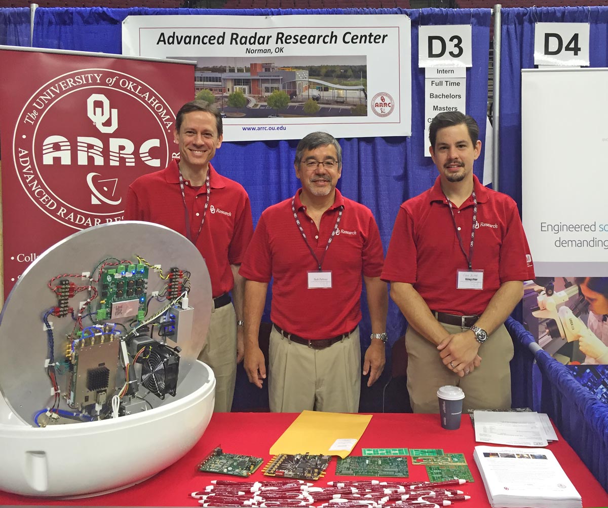 Drs. Mark Yeary, Robert Palmer and Caleb Fulton are at the Texas A&M Career Fair to recruit engineers and students to the University of Oklahoma. On the desk, to the left, is one of the ARRC's latest creations, an extremely low-cost multi-beam X-band radar--Reflect Array.
