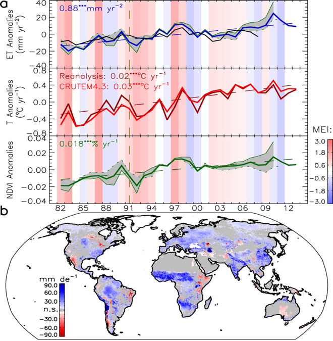 The research team first generated a long-term global satellite record of land evapotranspiration using remote sensing satellite data since 1982. They investigated multi-decadal changes looking at trends between 1982 and 2013. In addition to global evapotranspiration trends, they examined vegetation greenness and general climate data including temperature, precipitation and cloudiness. Collectively, results show that during the past 32 years general increasing trends in both plant growth and evaporation with recent climate change mainly driven by vegetation greening and rising atmosphere moisture deficits. The study predicts that a continuation of these trends will likely exacerbate regional drought-induced disturbances, especially during regional dry climate phases associated with strong El Nino events.