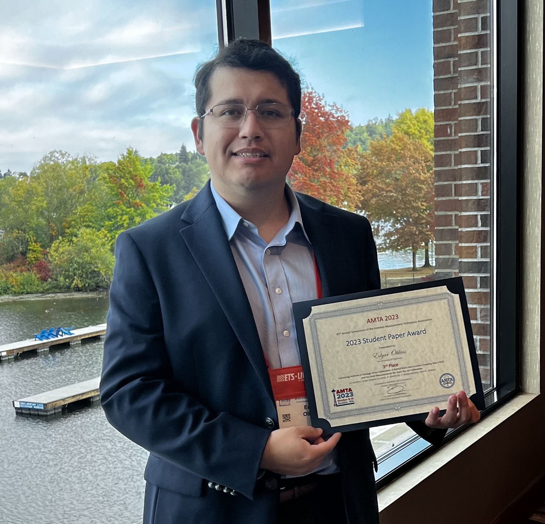 Congratulations to ARRC/ECE graduate student, Alexis Oblitas, who was awarded third place for his paper “Enhancing On-Chip Antenna mmWave Calibration: A Hybrid Multi-Axis Scanner Enabling Near-Field and Far-Field Measurements for Over-the-Air Calibration”at the IEEE Antenna Measurement Techniques Association (AMTA) Symposium held in Seattle. WA. Oct. 8-13. Alexix is advised by Dr. Jorge Salazar.